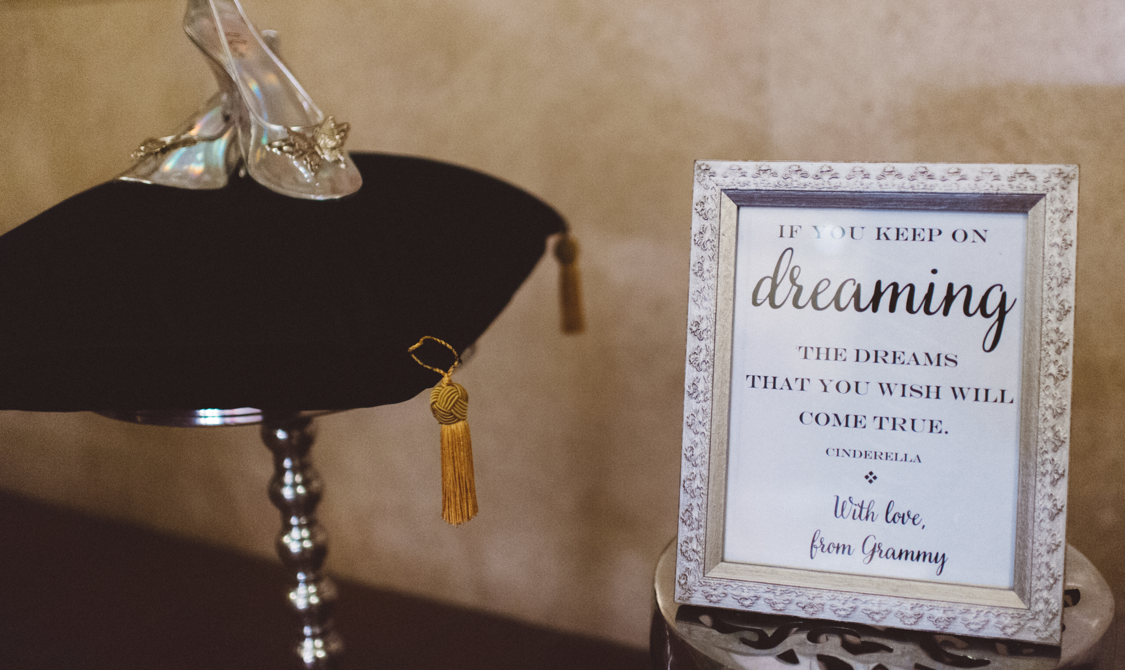 Tucked in a nook on the staircase sat a surprise for Rebecca, arranged by her mother. A pair of glass slippers were displayed alongside a sign reading “If you keep on dreaming, the dreams that you wish will come true,” a quote from the bride + her late grandmother’s favorite book to read together.