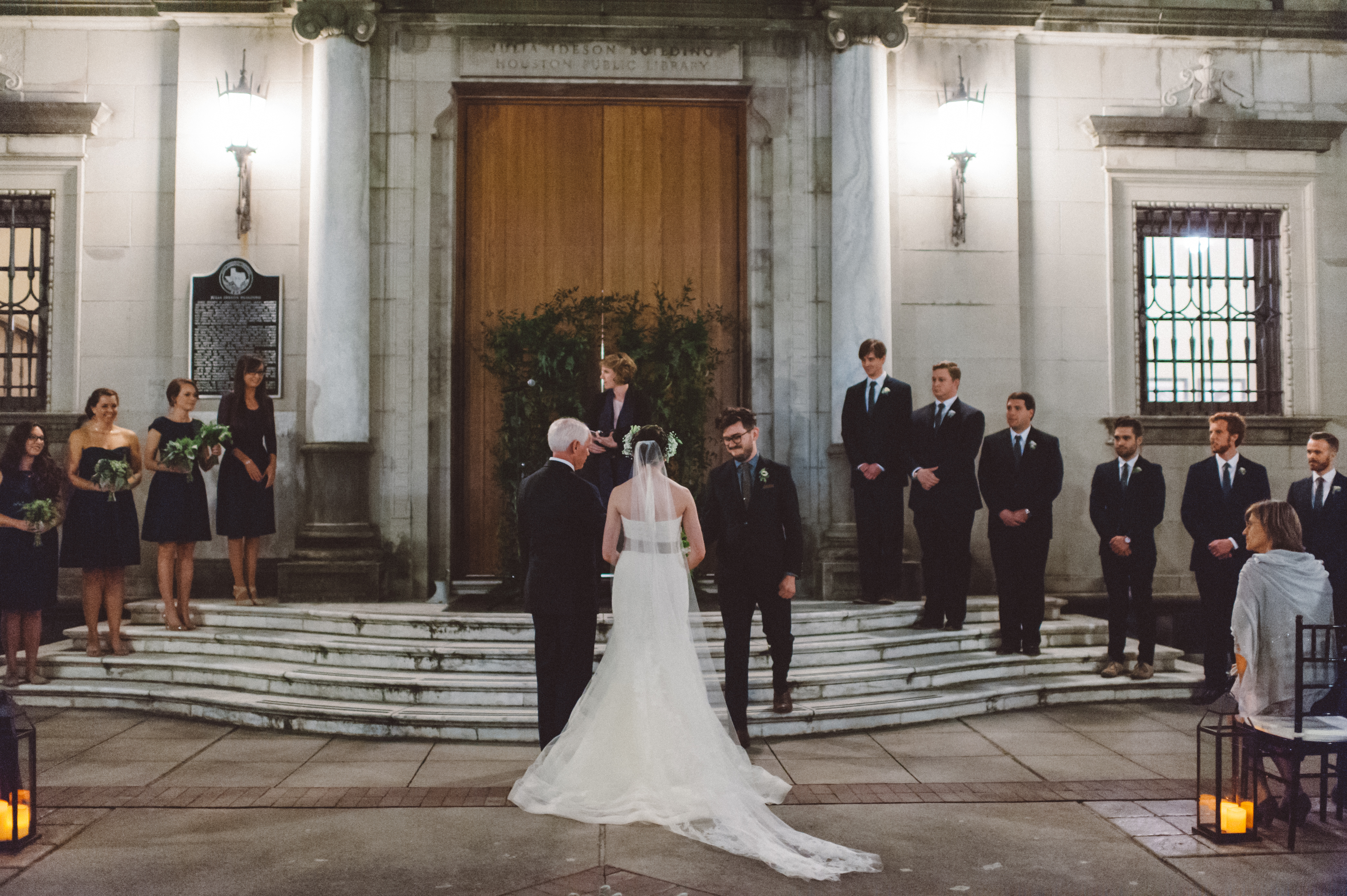For two New York writers, there could not have been a more perfect Houston wedding venue than the historic Julia Ideson Library. Nestled in the heart of downtown, this building stands out among sleek skyscrapers with its intricate architecture, beautiful courtyard and interior rooms lined with shelves housing hundreds of books. This venue suited Rebecca + Michael’s romantic and literary vision perfectly, and was conveniently located in the bride’s hometown.