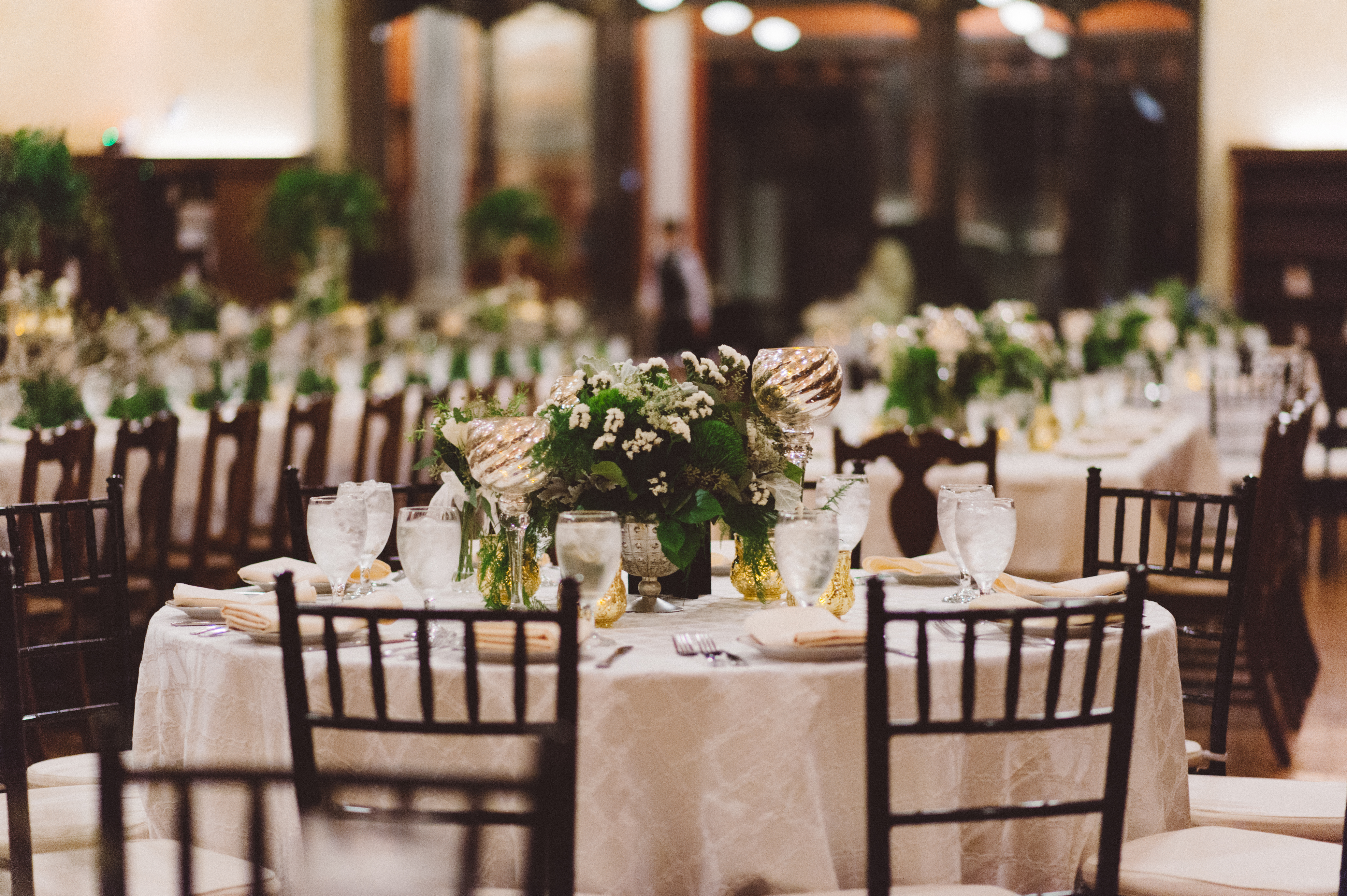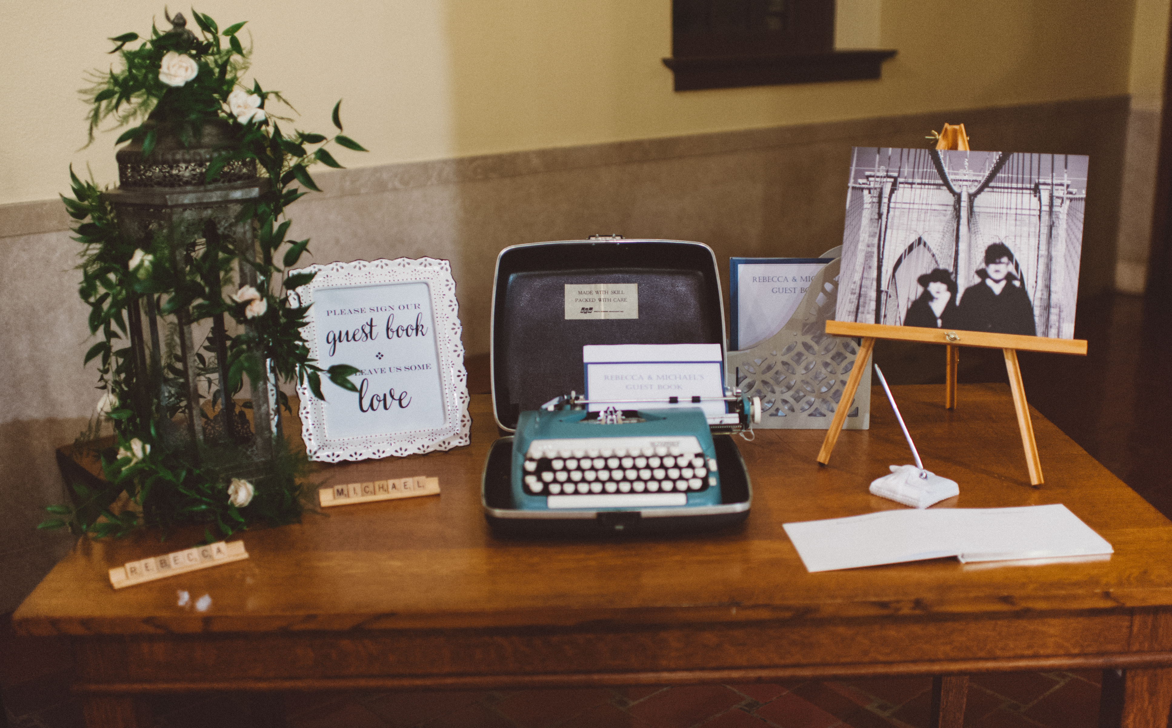 Once we secured the venue, each detail of Rebecca + Michael’s wedding was chosen and designed to highlight the dreamy feel of the building, while also playing off the library theme. After watching the bride + groom exchange vows on the front steps of the library, guests were ushered into the building’s lobby for cocktail hour. Here they could sign in + leave the couple well wishes on a vintage typewriter, as well as read about the building’s rich history on display throughout the first floor.