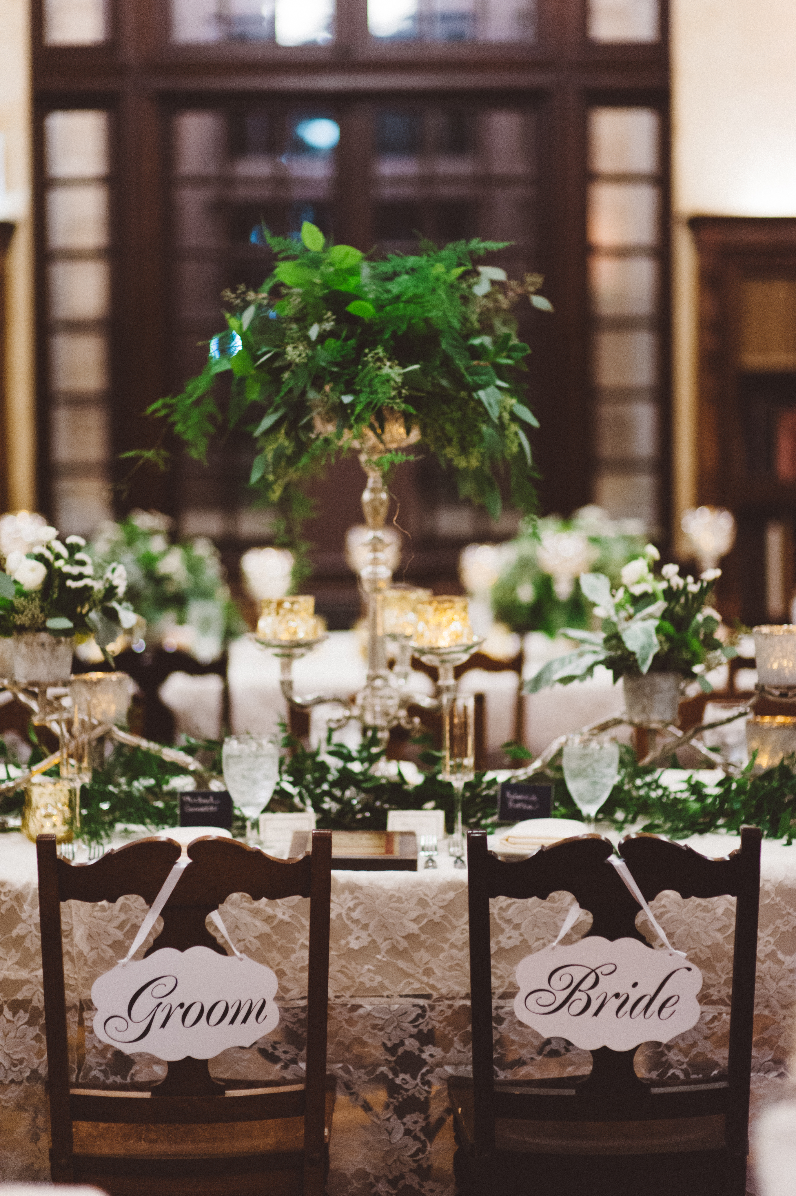 Continuing up the stairs, guests found their place cards on a unique tiered display, and then made their way into the Reading Room for dinner. The space was bordered by wooden shelves filled with books. To personalize the space, family wedding photos were added to several shelves. Custom cocktail napkins were also placed at the bar, featuring a drawing of a bride that Rebecca created as a child. A long head table seating over 40 people was placed in the center of the room, topped with a delicate lacey linen. A runner made of greenery, silver branches + candles spanned the length of the table, with several tall candlesticks topped with floral added in. Floral centerpieces with pops of blue that mirrored the color of the bridesmaid dresses sat atop each guest table, along with tons of candles to give the room a romantic glow.